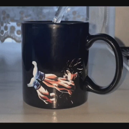 Magic heat-changing ceramic mug featuring Goku from Dragon Ball anime. Pour hot water to reveal hidden designs!